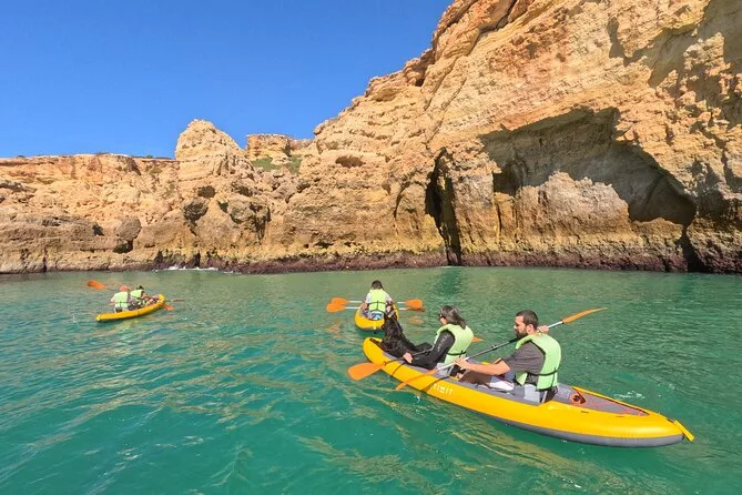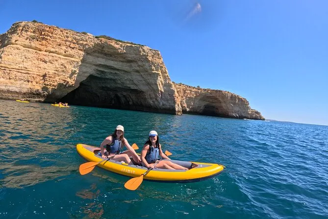 Seu dia inclui todo o equipamento para caiaque — caiaque, remo, colete com suporte lombar — e sacos impermeáveis para seus pertences. Um guia local acompanha você desde a Praia do Carvalho, passando por cavernas até a Gruta de Benagil e Praia da Marinha, tirando fotos 4K gratuitas da aventura; seguro está incluso, e o passeio termina com descanso na areia.