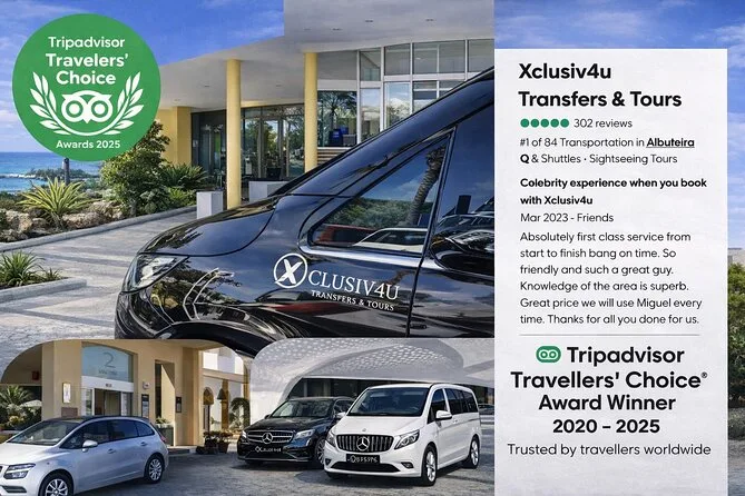 Seu transfer inclui transporte privado com busca flexível em qualquer lugar do sul de Portugal ou Espanha — incluindo o aeroporto de Faro — com cadeirinhas para bebês disponíveis e espaço para carrinhos ou animais de serviço, se precisar.