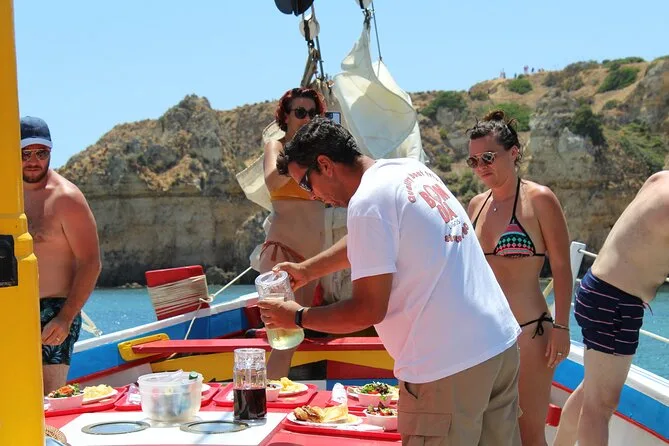 Seu passeio de meio dia inclui navegação saindo de Lagos com uma tripulação local rumo às grutas da Ponta da Piedade. O almoço é preparado na hora a bordo — frango grelhado com salada, pão, frutas da estação — acompanhado de vinho e água durante a refeição. Você vai trocar para um barco menor para explorar as grutas antes de nadar ou relaxar sob o sol do Algarve.
