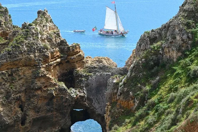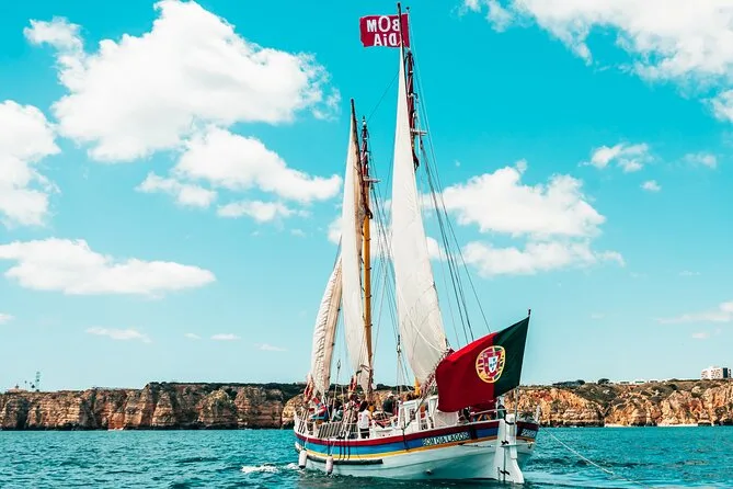 Seu dia inclui vaga em um barco à vela português tradicional saindo de Lagos, com uma equipe multilíngue e simpática guiando você pela costa até as grutas da Ponta da Piedade, além de um passeio em barco menor dentro das cavernas — animais de serviço e carrinhos são aceitos.