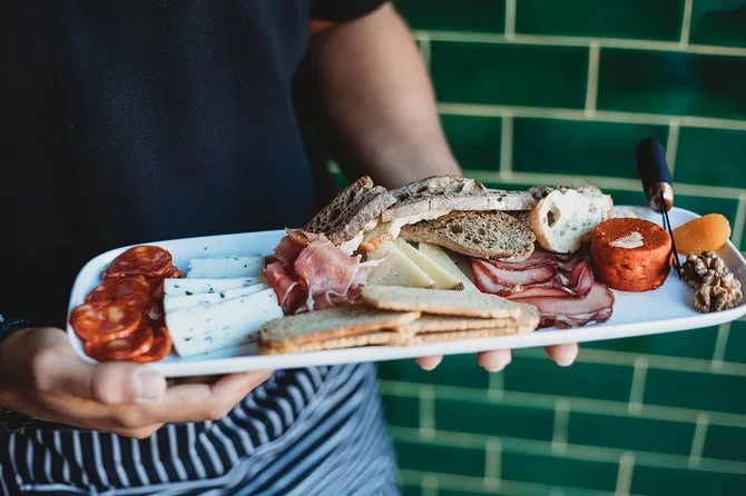 O menu foca em queijos e embutidos; opções vegetarianas podem ser limitadas.