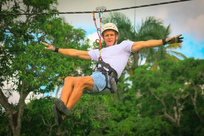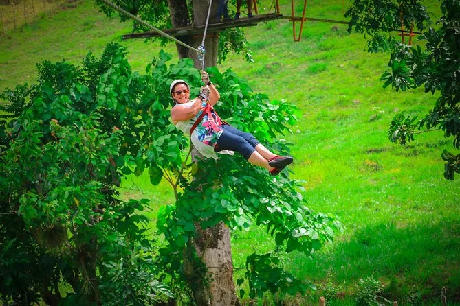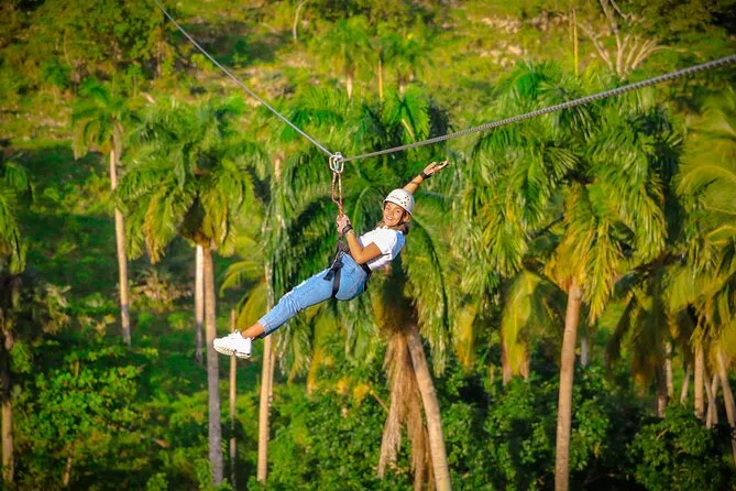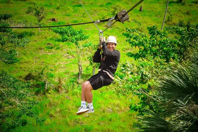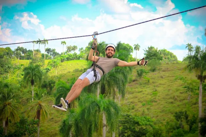 O seu dia inclui transfer com ar-condicionado saindo das áreas de Punta Cana, entrada no Parque de Aventuras Hacienda Tuko com acesso a oito tirolesas e a ponte suspensa, além de uma tigela de frutas frescas e água para refrescar antes do retorno de van.