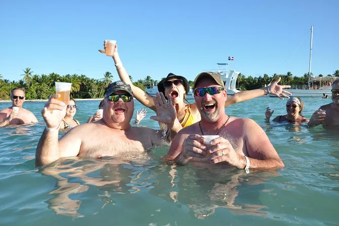 Depois, seguimos para uma área rasa chamada piscina natural — todo mundo falando mais alto agora, talvez aliviado ou pelo efeito do rum punch começando a fazer efeito. Estar com a água na cintura, um drink gelado na mão e música vindo do barco… isso ficou marcado pra mim. Alguns jogavam bola inflável; outros simplesmente flutuavam olhando as nuvens passando devagar no céu de Punta Cana. Não foi perfeito — meus óculos embaçaram duas vezes e perdi a toalha de vista — mas isso só deixou tudo mais real.