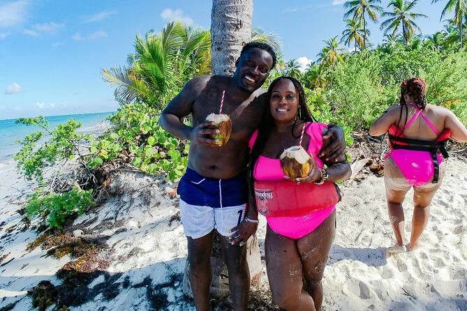 Depois do snorkel, paramos numa praia pequena onde me entregaram um coco com rum (eles chamam de “Cocoloco” — tente falar isso três vezes rápido). A areia estava quente, mas não demais; palmeiras por todos os lados. Alguns foram até a água na altura da cintura numa piscina natural, enquanto outros ficaram flutuando com drinks do bar que literalmente fica ao seu lado na água. Em um momento, Li — um dos tripulantes — tentou me ensinar a falar “gracias” no espanhol dominicano e riu quando eu errei. A comida saiu da grelha: frango, peixe, batata frita... tudo com um sabor especial depois de nadar.