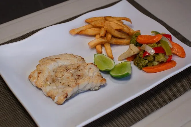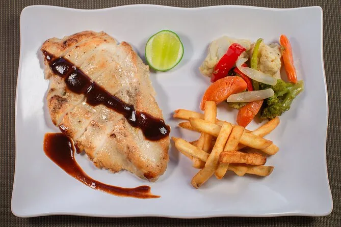 Você vai saborear frango ou peixe grelhado na hora, acompanhado de batatas fritas e legumes da cozinha flutuante.