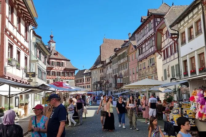 Sua tarde inclui transporte confortável de ônibus com ar-condicionado saindo de Zurique, entradas para as Cataratas do Reno no Castelo de Laufen com acesso à exposição Historama, passeio guiado pelo centro histórico de Stein am Rhein com bastante tempo para fotos e explorar as ruas de pedra — tudo conduzido por um guia local multilíngue, com retorno a Zurique no fim do dia.