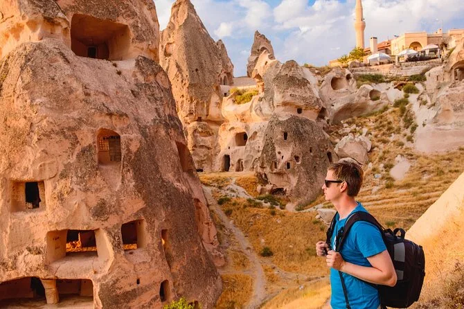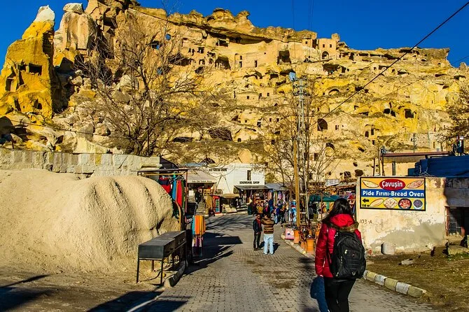O tour inclui Vale dos Pombos, Chaminés de Fada, Castelo de Uchisar, Museu a Céu Aberto de Zelve, cidade de Avanos (para almoço), oficina de cerâmica e Cidade Subterrânea de Özkonak.