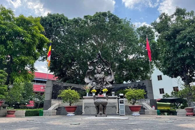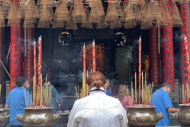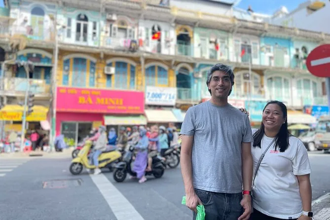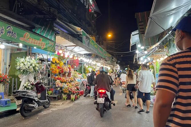 Você visita mercados (incluindo um grande mercado de flores), prédios antigos de 1968, altares e bairros locais em Cholon.