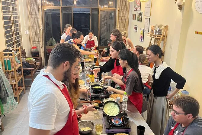 Seu dia inclui encontro na rua Nguyen Ba Lan em Da Nang para um tour guiado pelo mercado para escolher ingredientes; todos os utensílios de cozinha fornecidos; preparo prático de cinco pratos locais; café ou chá; almoço ou jantar compartilhado com frutas e vodka de arroz; além do seu livro de receitas e certificado antes de seguir viagem.