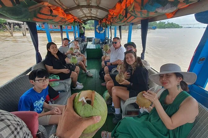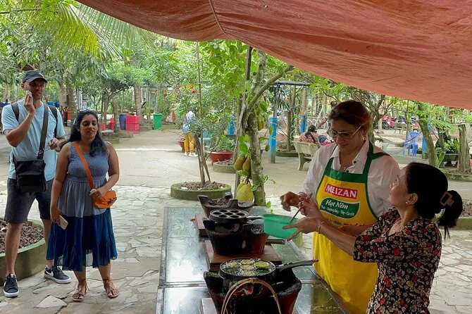 Seu dia inclui busca em hotéis centrais de Ho Chi Minh ou ponto de encontro, transporte em veículo com ar-condicionado, todos os passeios de barco (barco a motor e sampan remado), passeio de bicicleta pelos coqueirais se desejar, degustação de chá de mel e doce de coco feitos por produtores locais, preparo do tradicional bánh khọt com chef local no almoço (com opção vegana), entrada no Pagode Vinh Trang na opção luxo, frutas tropicais da estação em pomar com apresentação de música folclórica ao vivo — e retorno para o Distrito 1 ao final.