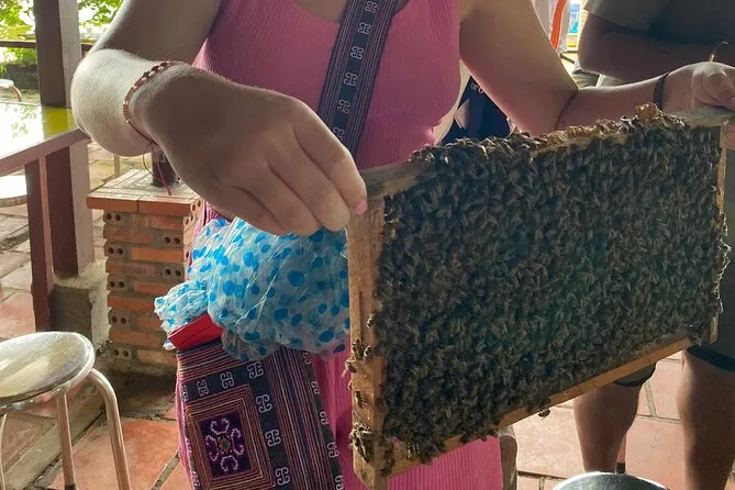 Você visita uma fazenda de abelhas, prova vinho de mel e de arroz, caminha pelas vilas e rema pelos canais de coqueiros.