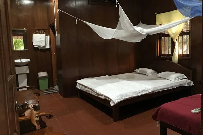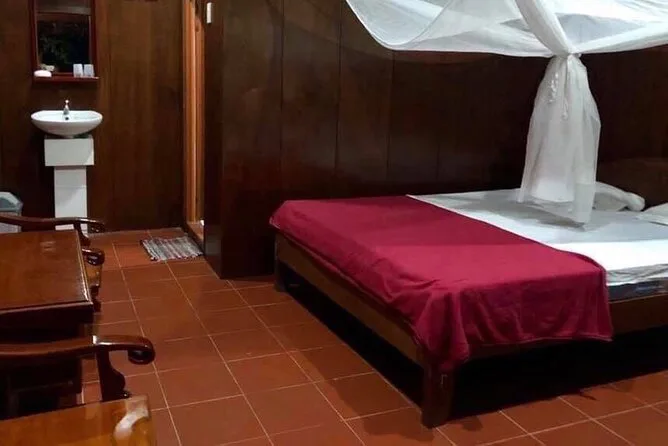 Você ficará em uma pousada local com ar-condicionado e banheiro privativo — simples, mas confortável.