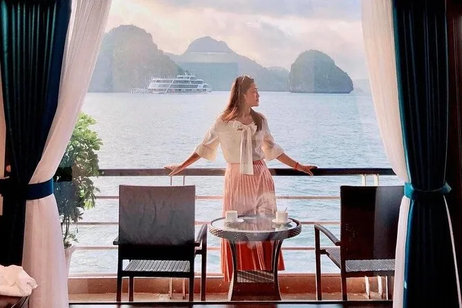 Você vai navegar por Ha Long & Lan Ha Bay em uma cabine privativa com varanda, com todas as refeições inclusas — faça caiaque em enseadas tranquilas, experimente Tai Chi ao nascer do sol no convés, participe de uma aula de culinária vietnamita e relaxe com música ao vivo após o jantar. É paz total, mas nunca monótono; você vai lembrar como é acordar cercado por água.