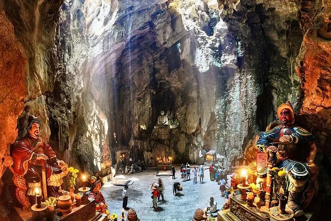 Depois, fomos para as Montanhas de Mármore. Subimos degraus de pedra, lisos pelo tempo e pelo passo de tantas pessoas; minhas pernas reclamaram, mas a vista logo as fez calar. Dentro das cavernas, um silêncio quase sagrado — só o cheiro de incenso subindo em raios de luz e alguém cantando baixinho em vietnamita. Minh contou algumas lendas locais (peguei só metade porque estava ofegante), mas dava para sentir a história antiga daquele lugar. De volta à moto, o vento secando minha camisa, comecei a entender por que tanta gente fala bem do passeio pelo Hai Van Pass. Não é só a paisagem — é a sensação de passar de nuvens para vales iluminados pelo sol em minutos.