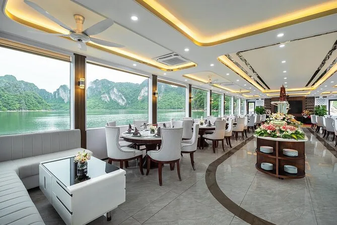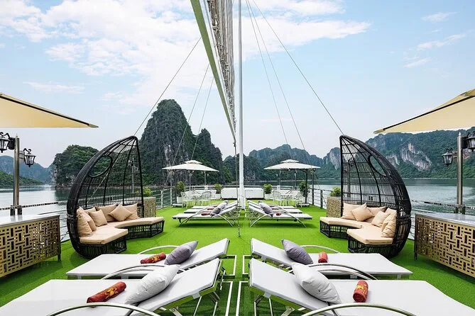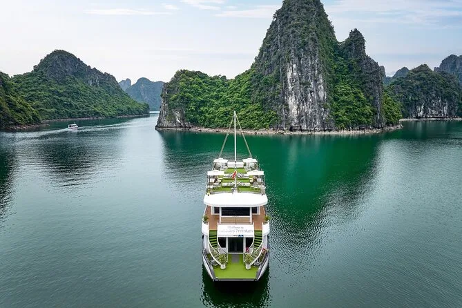 Deslize entre as famosas ilhas de calcário da Baía de Halong em um cruzeiro premium com jacuzzi, explore as câmaras fresquinhas da Gruta Surpreendente, faça caiaque ou passeio de barco de bambu na Baía Luon, e caminhe ou nade na Ilha Titop. Inclui traslado do Bairro Antigo de Hanói e almoço buffet caprichado — além de petiscos no pôr do sol no retorno ao porto.