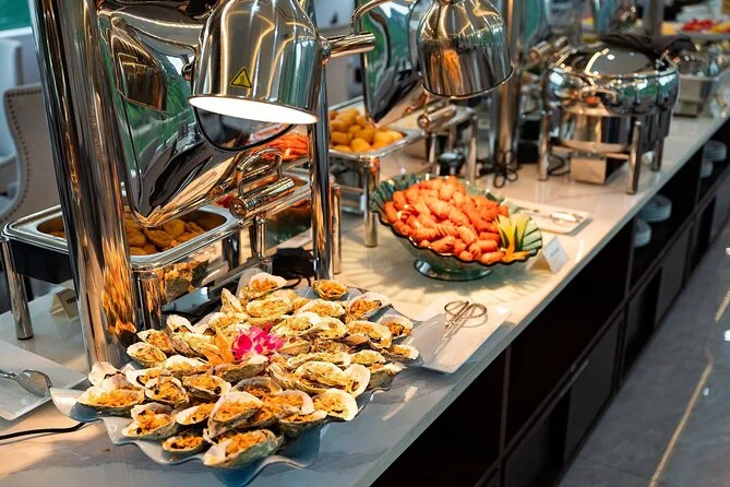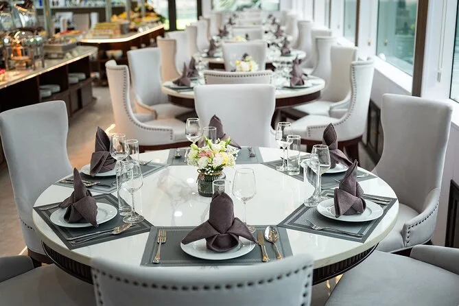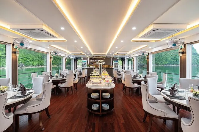O almoço é um buffet com pratos vietnamitas de frutos do mar e algumas opções ocidentais a bordo.