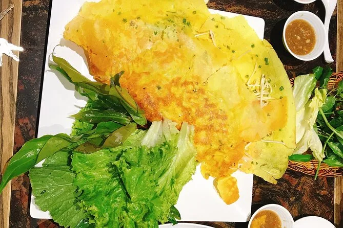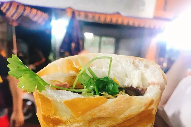 Dependendo da opção, você vai provar banh mi, rolinho de arroz no vapor, arroz quebrado com porco grelhado, banh xeo (panqueca crocante), além de caldo de cana ou café local.