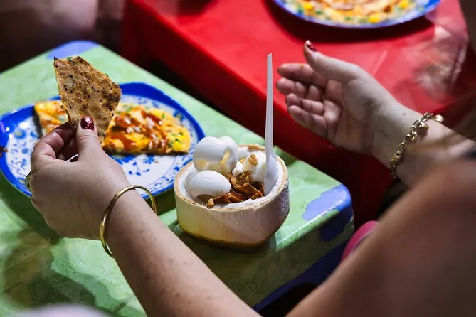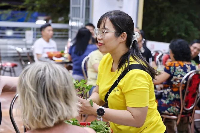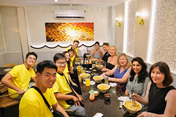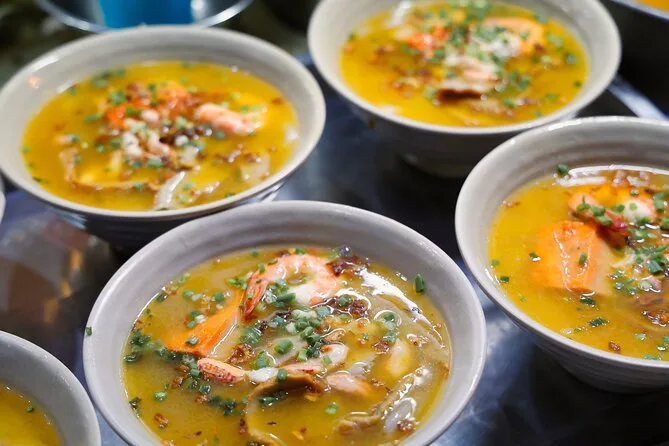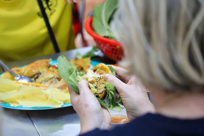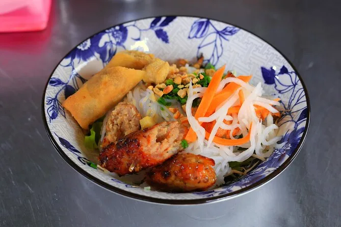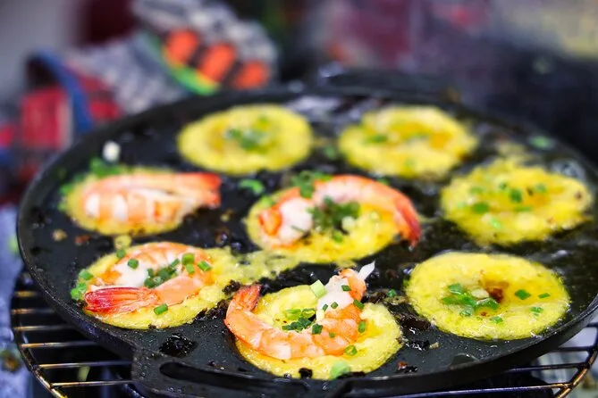 Você vai provar panquecas vietnamitas (banh xeo), sopas de macarrão como Bun Bo Hue ou Mien Ga, carnes de churrasco de rua e sobremesas tradicionais vietnamitas.