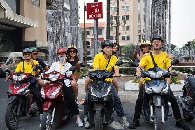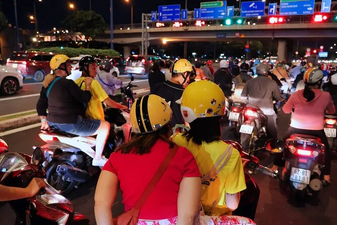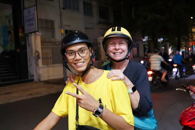 Sua noite inclui traslado grátis de ida e volta ao hotel em Ho Chi Minh, todas as comidas de rua — de panquecas a sopas e carnes de churrasco — além de bebidas ilimitadas (água e cerveja), seguro contra acidentes para sua tranquilidade, seu próprio guia local que fala inglês durante toda a noite — e claro, capacetes (e capas de chuva se pegar chuva).