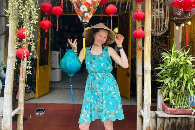Eu não esperava fazer algo que realmente quisesse guardar — mas quando amarramos os pingentes no final e dobramos as lanternas (tão inteligente), deu uma sensação estranha de satisfação. O Sr. Tuan até fez uma lanterna extra para cada um como presente; ele escolheu cores que achava que combinavam com nossa personalidade (a minha foi amarelo vibrante — não sei o que isso diz de mim). Ainda penso naquele azul da seda toda vez que vejo minha lanterna pendurada na janela de casa. Se você quer algo de verdade para fazer em Hoi An além de só andar pelas ruas ou comprar lembrancinhas que logo esquece, essa é a pedida… a não ser que você seja péssimo com cola.