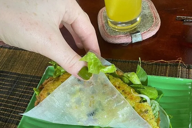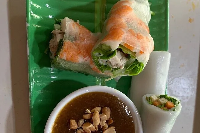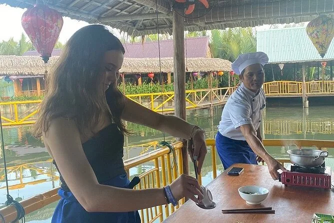 Seu dia inclui traslado de ida e volta no hotel em Hoi An, todos os ingredientes frescos do mercado local, passeio guiado de canoa de bambu pela floresta de coqueiros de Cam Thanh, aula prática com chef que fala inglês numa casa de palafitas à beira do rio, água mineral e suco de maracujá ilimitados durante a aula, além do almoço ou jantar feito por você — e ainda leva para casa um par de hashis de lembrança.