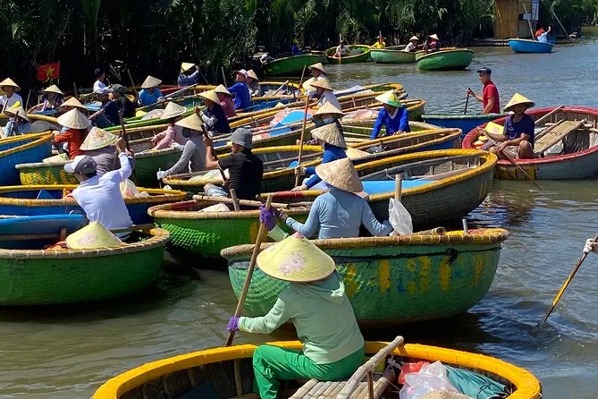 Você vai navegar em canoas tradicionais redondas de bambu pela floresta de coqueiros de Cam Thanh antes da aula de culinária.