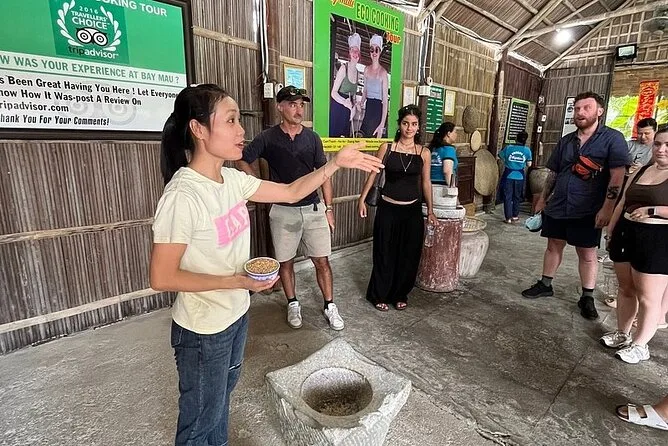 A parte de cozinhar aconteceu numa casa de palafitas de madeira à beira do rio — janelas abertas, ventiladores sussurrando, tigelas cheias de legumes coloridos por todo lado. Amassamos arroz num pilão pesado até meus braços doerem (mais difícil do que parece), depois moemos até virar leite para as panquecas. Miss Lan ensinou a enrolar os rolinhos de salada bem apertados para não desmancharem — os meus ficaram meio tortos, mas o molho de pimenta salvou o sabor. O almoço foi o que preparamos: pho de carne ou frango, panquecas de arroz, bun bo nam bo... e suco de maracujá à vontade. Sério, até agora fico lembrando daquele caldo da sopa.