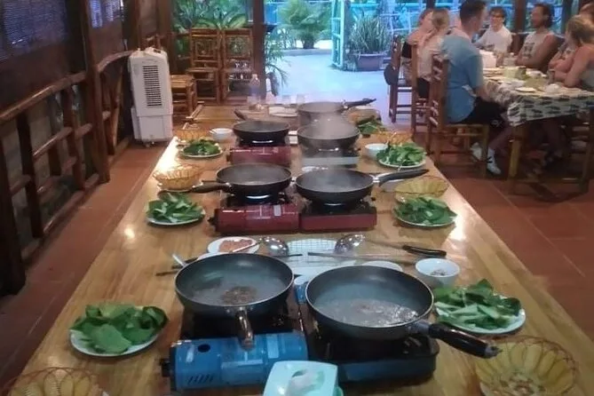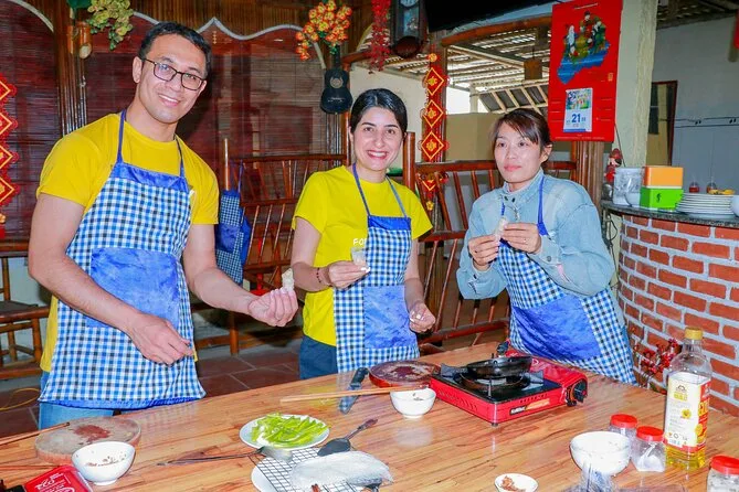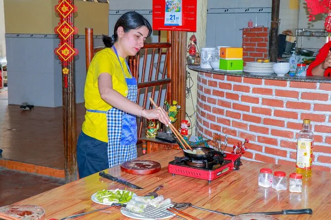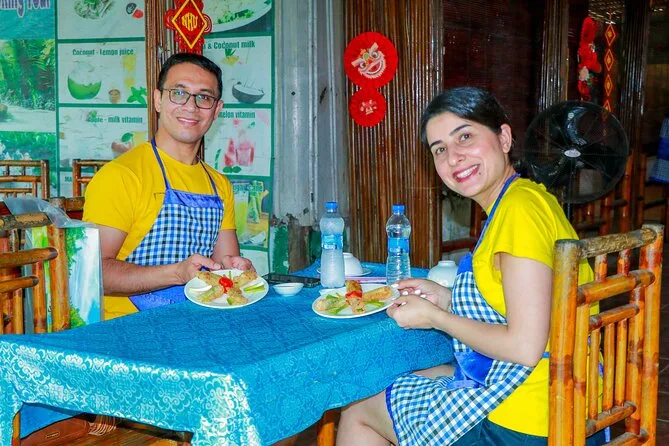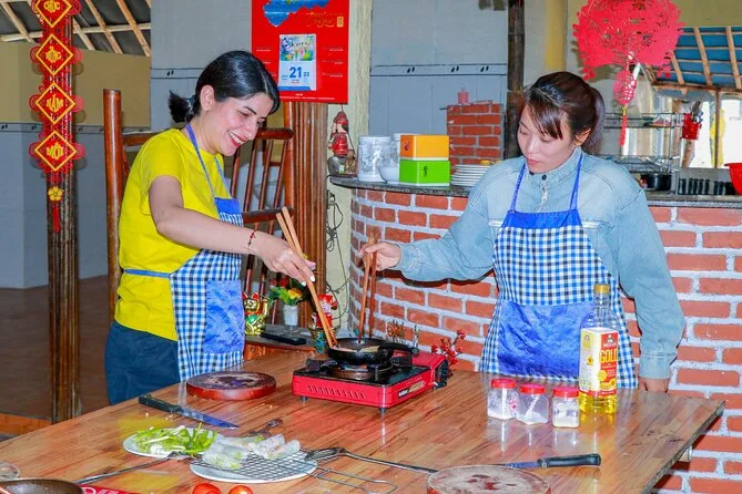 Você vai preparar rolinhos primavera de Hoi An, panquecas de arroz, salada de flor de banana com porco e camarão, macarrão frito com frutos do mar — ou versões vegetarianas, se preferir.