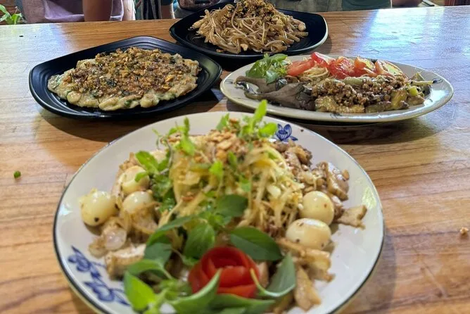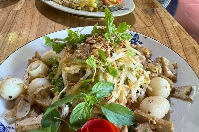 A aula de culinária rolou numa cozinha aberta perto da água, com passarinhos cantando lá em cima e um rádio tocando músicas antigas vietnamitas. Fizemos panquecas crocantes (banh xeo), salada de flor de banana com camarão, berinjela grelhada com molho de amendoim… Minha panqueca rasgou na hora de virar, mas ninguém ligou; Tam me mostrou como consertar com papel de arroz extra. O almoço foi o que preparamos — doce e salgado, com ervas frescas por toda parte — e, sinceramente, até hoje penso naquela banana grelhada com caramelo de sobremesa. Levei um cartão com as receitas para casa, mas o que ficou mesmo foi o jeito que Tam mostrou como fatiar a mamão bem fininho.