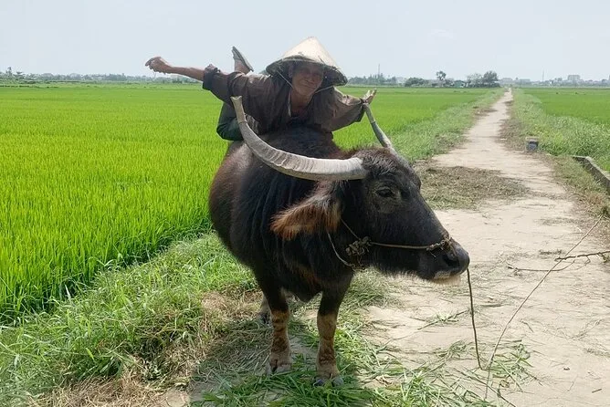 Você vai pedalar por estradas tranquilas entre arrozais saindo de Hoi An com um guia local, ajudar na horta da Vila Tra Que, tomar um café vietnamita forte numa cafeteria da vila, ver artesãos da madeira em ação e fazer uma pausa para refletir numa pagoda tranquila antes de voltar — prepare-se para pequenas surpresas pelo caminho.