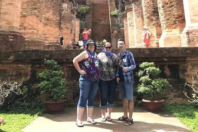 Subindo para as Torres Cham de Po Nagar, me distraí com a fumaça do incenso que se enrolava entre os tijolos antigos. É impressionante pensar que essas torres estão aqui desde o século VII — Hien disse que ninguém sabe exatamente como foram construídas com tanta precisão. Ficamos ali em silêncio por um tempo; gostei que ela nos deixou apreciar sem pressa. Depois fomos para a Pagoda Long Son — subir aqueles degraus no calor não foi fácil, mas ver o enorme Buda branco no topo fez minhas pernas esquecerem o cansaço por um instante. Crianças riam perto, tentando tocar o grande sino de bronze (mas não alcançavam).