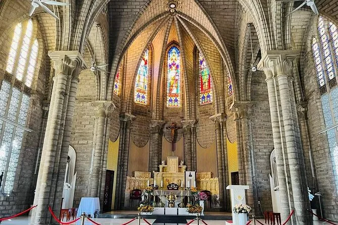 O Museu Oceanográfico Nacional parecia meio desgastado, mas fascinante — frascos com criaturas marinhas estranhas alinhados por todo lado, algumas tão pequenas que era preciso apertar os olhos para ver. O prédio é no estilo colonial francês antigo; dava para imaginar os cientistas de jaleco branco circulando por ali antigamente. A última parada foi a Igreja de Pedra — fresquinha depois de tanto sol, os vitrais coloridos projetando tons estranhos no chão. Ficamos sentados ali em silêncio por um minuto antes de voltar para o porto. Confesso que às vezes ainda penso naquela vista de Hon Chong.