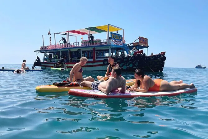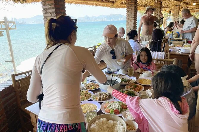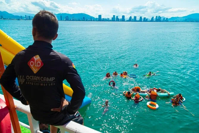 O dia inclui transporte de ida e volta para hotéis no centro de Nha Trang, todas as taxas e entradas pagas antecipadamente. Você terá acesso ao equipamento de snorkel, pranchas de SUP e tobogãs gigantes. O brunch traz pães caseiros e café após o snorkel; depois, cocktails ilimitados no bar flutuante e um almoço completo de frutos do mar vietnamitas com vista para a praia, antes do retorno ao pôr do sol.