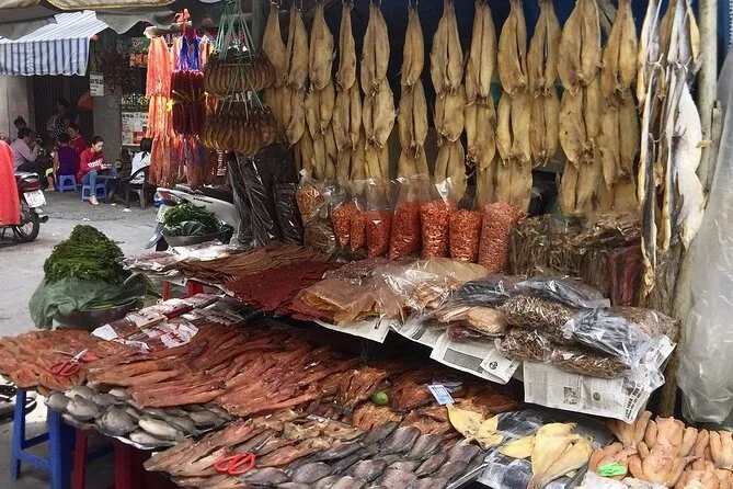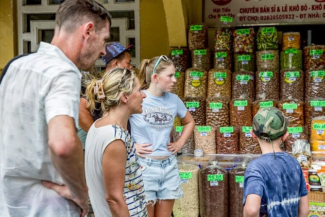 O templo Thien Hau estava cheio de fumaça e frescor, com espirais de incenso penduradas no teto como redemoinhos preguiçosos. Linh explicou que as pessoas vêm aqui para pedir proteção nas viagens; ela nos mostrou como acender o incenso (e eu acabei com cinzas por todo lado). Lá fora, homens mais velhos jogavam xadrez sob lanternas vermelhas desbotadas. Depois, exploramos o Mercado Binh Tay — fileiras de frutas secas, especiarias empilhadas, vendedores gritando preços em vietnamita e cantonês. Comprei gengibre cristalizado sem nem saber o preço; não importava. A torre do relógio do mercado dominava a paisagem, mas ninguém parecia reparar, só nós turistas com o pescoço esticado.