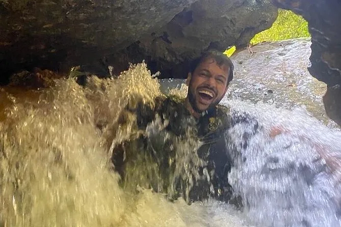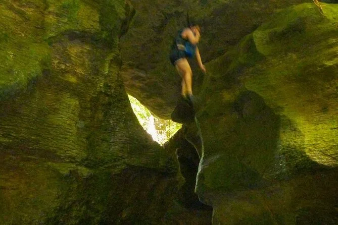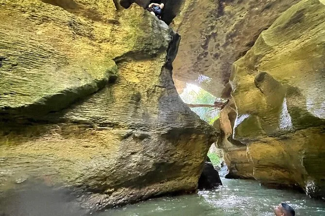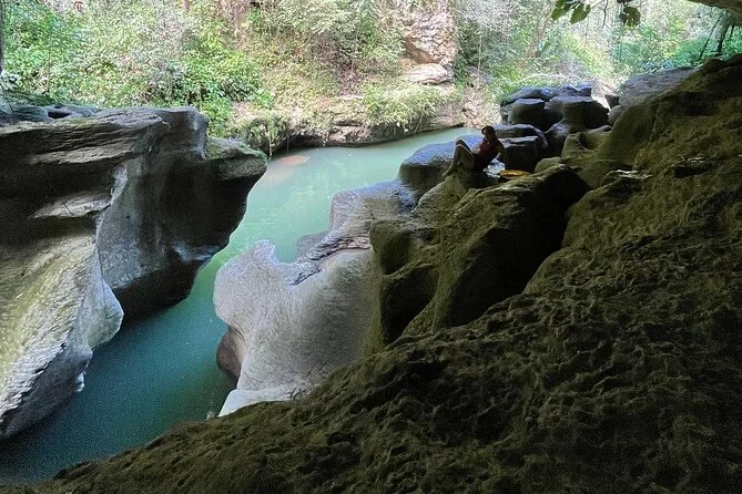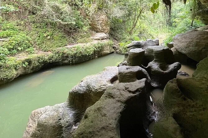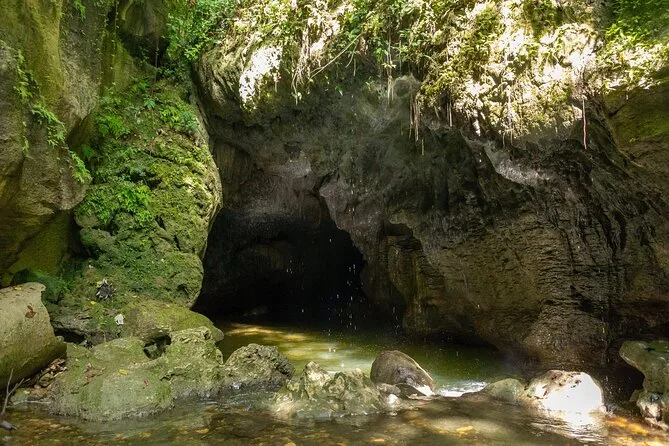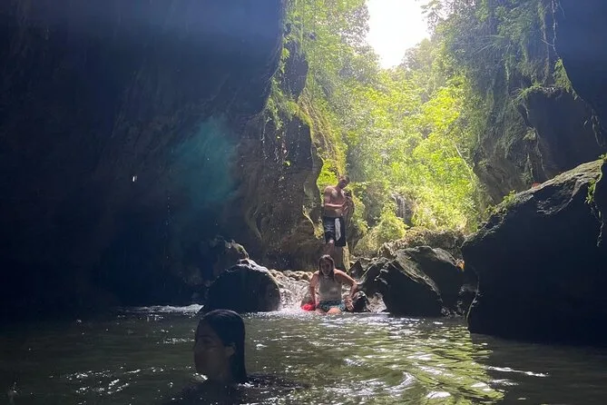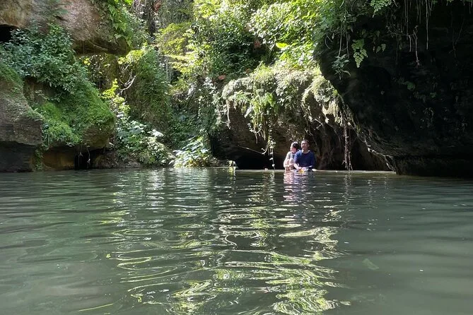 Swim in rainforest caves near San Juan with locals and wild river cliffs