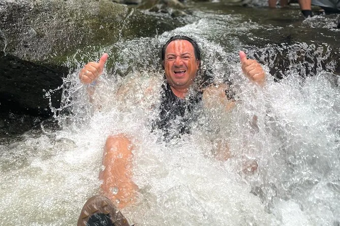 The trail itself wasn’t long — maybe a mile and a half? — but it was pure squelchy clay in places. My shoes will never be the same (worth it). We stopped every so often so Carlos could point out these wild plants and talk about Taino stories from the forest. At one point he handed me a leaf that smelled like citrus when you crushed it — I wish I remembered the name. When we finally reached Las Tinajas Falls, you could hear water rushing before you saw anything. There were locals already swimming, laughing, someone doing a backflip off a rock like it was nothing. I’ll admit: I chickened out on the big jump but did try the natural waterslide. Cold shock, then just pure laughter echoing off all that green.