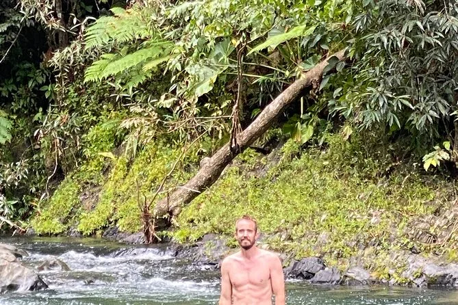 The first stop was this waterfall you see from the car window—no place to pull over, but José slowed down so we could all get a look. Water tumbling down 85 feet, white against all that green. Then came the walk through the forest itself. The path was muddy in spots (I slipped once but honestly, who doesn’t?), and when we reached the river, some people jumped right in. I hesitated because it looked cold—ended up wading anyway. The water was clear and shockingly fresh; I still remember how it felt on my skin after sweating through that hike.