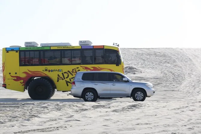 Your day includes pickup in an air-conditioned Land Cruiser with off-road insurance covered, guided dune bashing through Qatar’s massive sand dunes, two scenic photo stops (including a full 360° view), a camel ride experience led by locals, sand boarding gear if you’re brave enough to try it, time to swim or relax where desert meets sea at Khor Al Adaid, plus Arabic tea or coffee served in a traditional campsite before heading back.