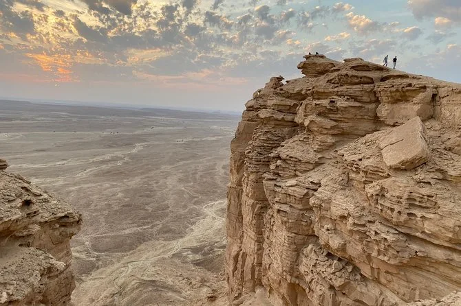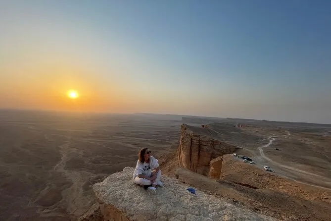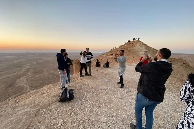 Your day includes pickup in a 4x4 vehicle with air conditioning from Riyadh, a visit to a camel farm, bottled water throughout, guided hiking at Edge of the World cliffs with time to explore alone if you want it, optional dinner cooked fresh on site (weather permitting), plus off-road driving and stargazing when skies are clear before returning in the evening.