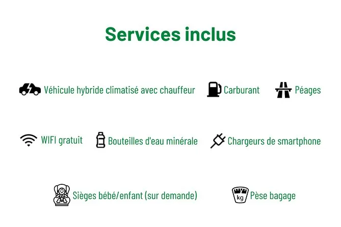 Your ride includes private transportation in an air-conditioned hybrid vehicle with free WiFi onboard, bottled mineral water waiting for you, assistance with luggage at both ends of your journey, smartphone chargers if you need them, plus specialized infant or child seats available by request—all fees and taxes are already covered too.