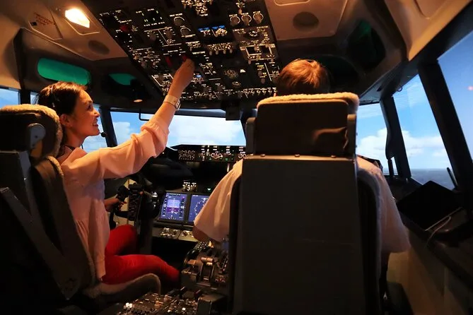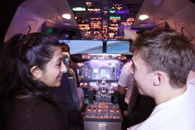 Your day includes full use of the Boeing 737-800NG flight simulator with guidance from qualified commercial pilots, complimentary snacks plus coffee or tea afterward, hot and cold water dispensers onsite, and a Certificate of Achievement to take home. Two guests can join you in the cockpit free of charge while others may relax in the lounge watching your flight on live TV.