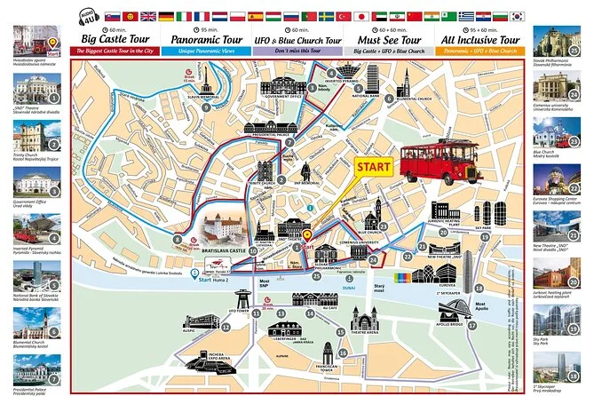 The tour includes a 20-minute stop at Bratislava Castle and a 15-minute stop at Slavin Memorial.