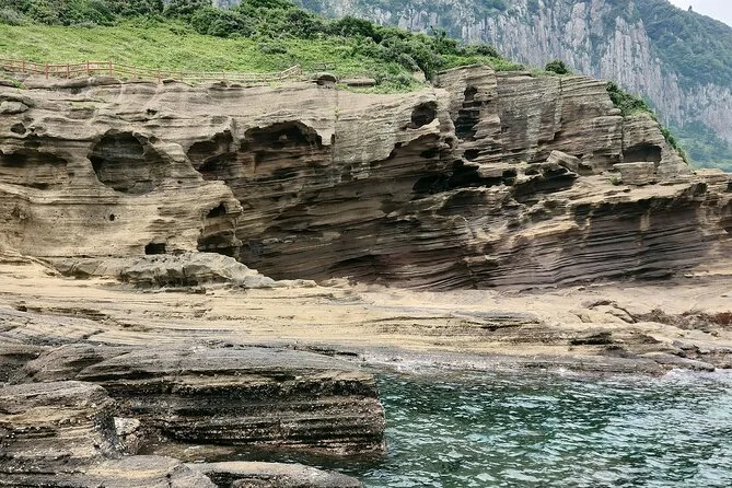 The sound at Cheonjeyeon Waterfall was louder than I expected — not roaring, but steady enough that we all went quiet for a bit. There’s something about watching water drop three levels into that blue pool that makes you feel small in a good way. We wandered down to Jusangjeolli Cliff after lunch (the sea wind is no joke — bring a jacket), where those hexagonal lava columns actually look fake until you touch them. Cold and rough under your hand.
