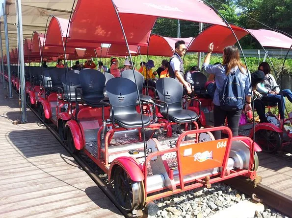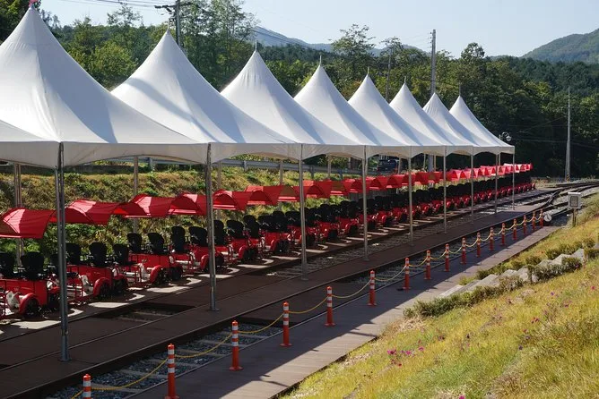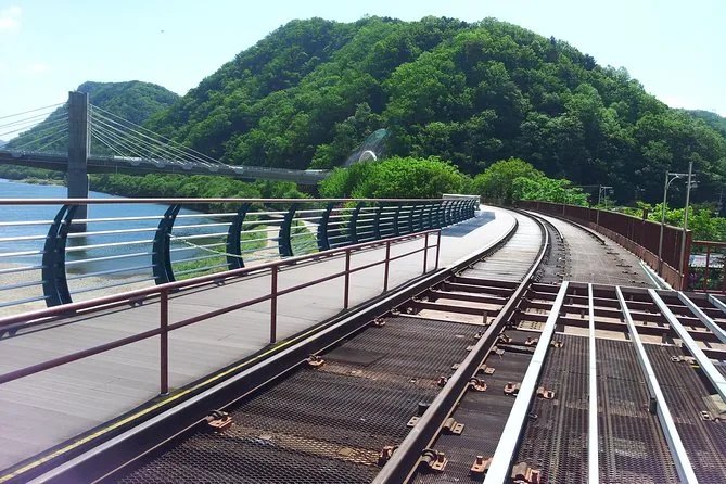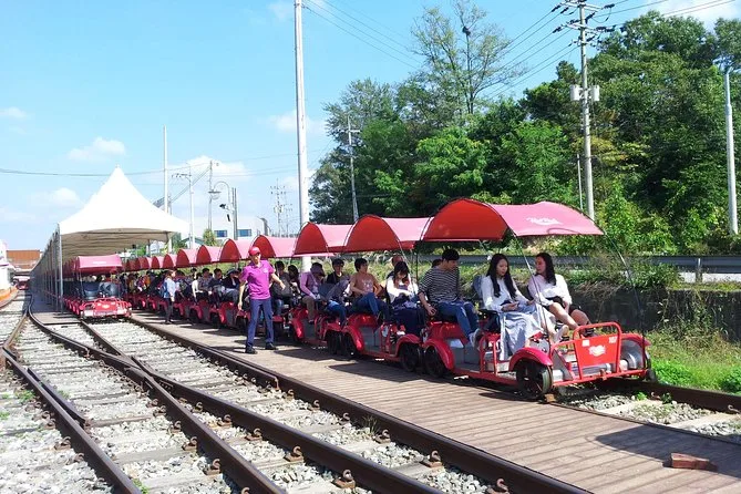 After that, we headed over to the rail bike park—not something I’d usually pick, but it was weirdly fun. You pedal these four-wheeled bikes along an old railway track right by the river, legs burning a bit but mostly just laughing at how off-sync we were. The air smelled like pine needles and river mud, which sounds odd but felt fresh after Seoul’s traffic. At one point, a train passed on the new tracks above us and everyone waved—it was such a small thing but made me grin.