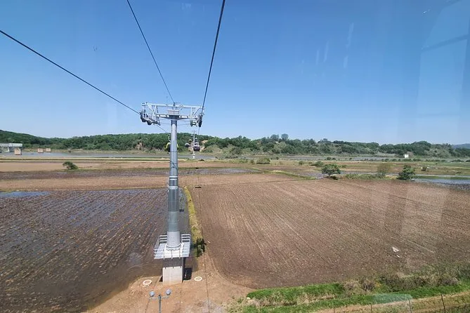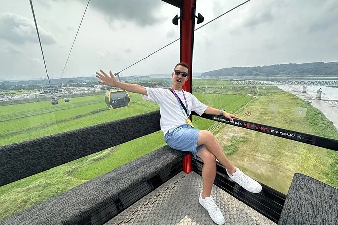 The optional gondola ride was… honestly a bit nerve-wracking for me (heights aren’t my thing), but the view over the Imjin River made my palms sweat for a good reason. You get this strange feeling of floating above history itself — there’s farmland below that nobody can touch because of old landmines or whatever else is buried down there. If you skip the gondola, Ji-won said there’s always the Red Suspension Bridge at Gamaksan Mountain later on — which wobbles just enough to make everyone laugh nervously as they cross. Li from our group tried to take a selfie mid-bridge and almost dropped his phone; we all cheered when he managed not to.