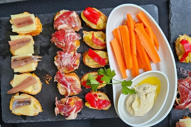 Each guest gets three Spanish tapas: jamón ibérico, tortilla española, manchego with anchovies, plus hummus and breadsticks.