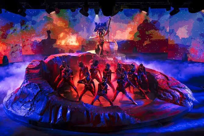 Your evening includes entry to Sala Scala in Gran Canaria for a three-hour Origen dinner show featuring live performances by over 30 artists plus a multi-course tasting menu designed by chef Andrés Rodriguez—all served right at your seat as part of this immersive experience.