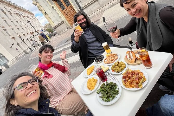 Your evening includes stops at four family-owned bars for high-quality traditional tapas such as padrón peppers, Spanish omelette, Iberian ham, croquettes, Manchego cheese, pork belly, infused olives and more; four drinks including wine or sangria; all led by a local gastronomic guide who shares cultural stories plus tips for exploring Madrid further after your crawl ends.