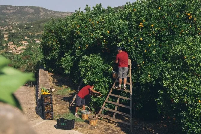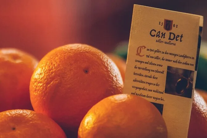 Your visit includes entry to the 400-year-old Can Det house in Sóller with its historic garden and traditional oil mill demonstration. You’ll enjoy a brunch-style tasting featuring local olive oil from ancient trees alongside Mallorcan bread, tomatoes, cheese, almonds, homemade orange marmalade plus fresh orange juice and local wine—all guided by members of the family themselves before you head back out into town.