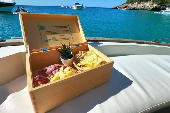 Your day includes departure from Cala Galdana with a local guide at the helm; all drinks like soda or bottled water; snacks including local olives and cheese; free use of paddle surf boards; snorkeling equipment for exploring underwater; plus restroom access on board before returning to shore in the afternoon.